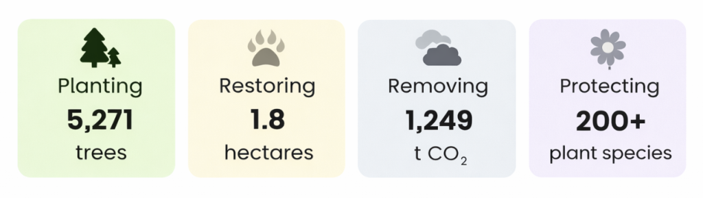 Restoration-focused plantings: Native seedlings have been strategically planted to support structural complexity, improve soil health, and enhance forest connectivity.
